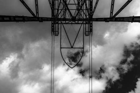 Silhouette of a power line pylon against the blue sky. Transmission of electricity from the power plant to the city. Unusual angle. Bottom view.