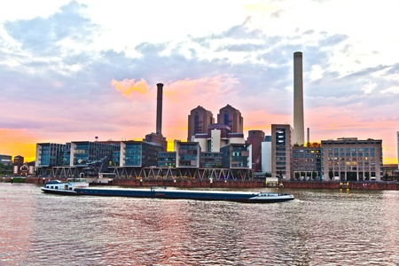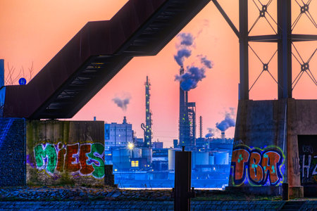 Industry by the river Rhine in Duisburg Ruhrort at sunset