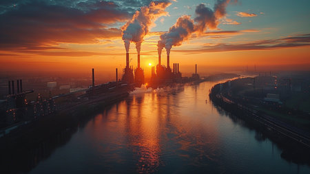 Sunset over a vast industrial complex, with silhouettes of factories, warehouses, and cooling towers against a dramatic sky, AI Generated