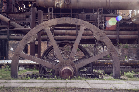 A very large steel flywheel at an abandoned steel mill