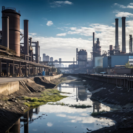 A polluted river surrounded by factories, with smokestacks adding to the air pollution above.