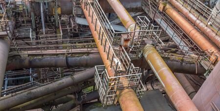 weathered rusty high angle industrial scenery with old corroded steel girders and metal tubes