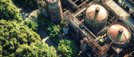 The view highlights the integration of industry and nature, featuring energy tanks amidst flourishing trees for sustainability.