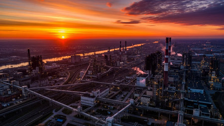 Aerial view of oil refinery at sunset in Frankfurt am Main, Germany