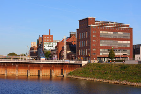 DUISBURG, GERMANY - SEPTEMBER 18, 2020: Skyline of Inner Harbour (Innenhafen) in Duisburg, Germany. Inner Harbour is a former industrial area redeveloped into culture and restaurant zone.