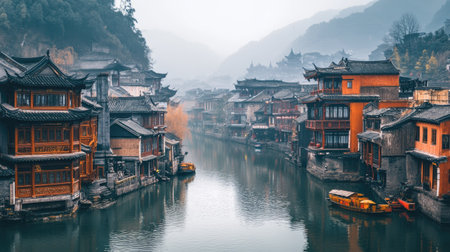 A panoramic view of a Chinese river town with ancient architecture. No people, copy space.