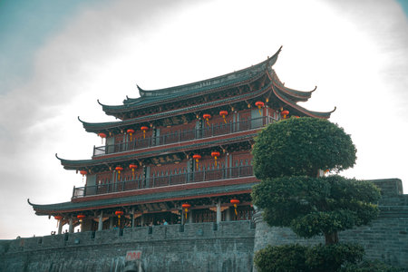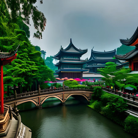 Traditional Asian Architecture featuring Beautiful Lanterns set in a Scenic and Serene Setting