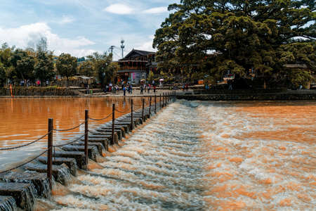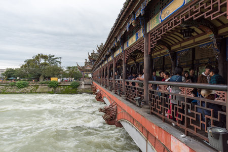 Chengdu, Sichuan, China. September 24, 2014 – Tourists go sightseeing at the Sichuan Dujiangyan Irrigation System Project in Sichuan, China. A dam is inheritance of ancient weir civilization.