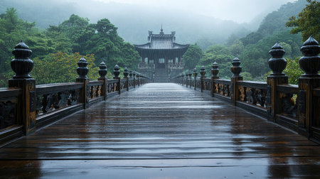 A serene wooden bridge leads to a traditional pavilion, surrounded by lush greenery and enveloped in misty rain. The tranquil atmosphere offers a peaceful escape into nature.