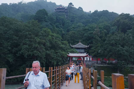 Dujiangyan, Sichuan, China - February 06, 2019: Tourist visiting Mount Qingcheng and walking around main entrance. Mount Qingcheng is a famous Taoism (Daoism) mountain in Dujiangyan, Sichuan, China.