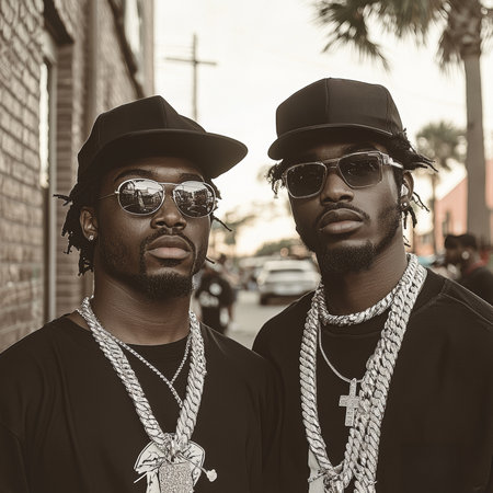 Portrait of two stylish men in sunglasses and chains, showcasing urban fashion outdoors. They exude confidence and modern style in a vibrant city setting.