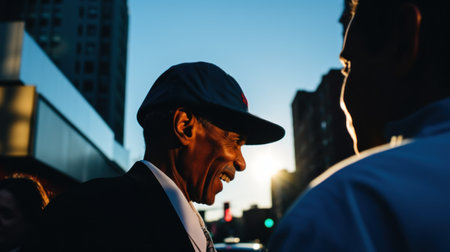 A man in a hat conversing with another man, displaying a friendly interaction and engaged in a conversation.. Generative AI