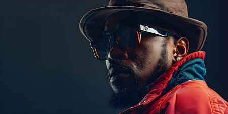 Black man fashion portrait on abstract colorful background. Afro american male model looking at camera, neon colored lighting. Created with Generative AI