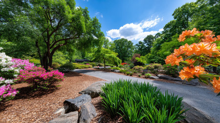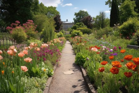 Scenic garden path with colorful flowers blooming on each side, creating a vibrant and peaceful atmosphere