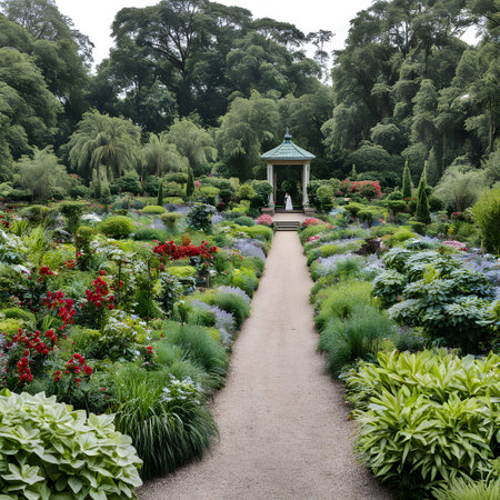 Stunning aerial view of an intricately designed garden featuring diverse plant life, rich greenery, and a peaceful atmosphere perfect for relaxation and inspiration.