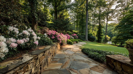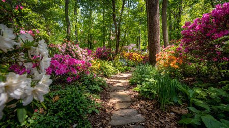 Inviting stone pathway winding through vibrant rhododendron garden in full bloom.