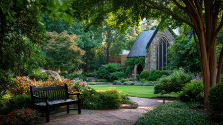 Concept photo of a serene garden, located within the church grounds, filled with colorful flowers and quiet seating areas for contemplation and meditation