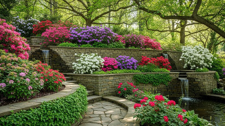 221421 showing lush terraced garden with stone walls waterfalls and vibrant blooming azaleas and roses.