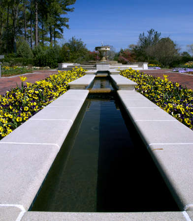 Discover a tranquil garden scene featuring a reflective water feature surrounded by lush greenery and vibrant flowers, offering a peaceful escape.