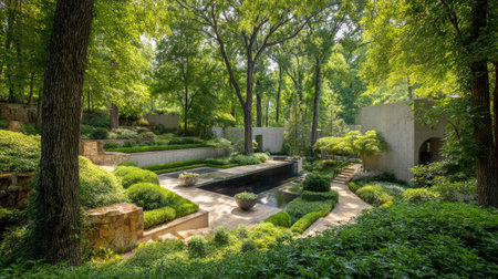 A stunning modern garden showcasing lush greenery, a reflecting pool, and elegant stone pathways. This tranquil outdoor space offers serenity and beauty in natural surroundings.
