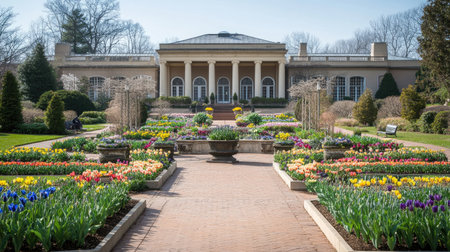 A beautifully landscaped spring garden filled with vibrant tulips in various colors, set against a historic building, creating a serene and picturesque scene.