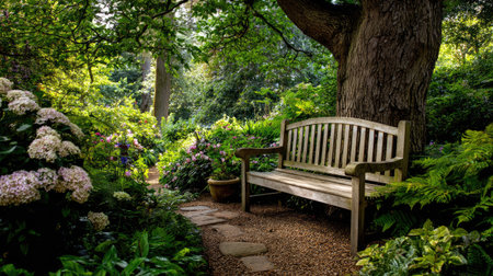 A serene wooden bench nestled in a lush garden, surrounded by vibrant flowers and greenery, creating an inviting space for relaxation and contemplation.