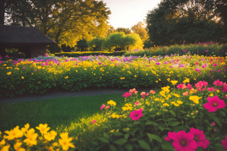 Vibrant Flower Pathway Surrounded by Lush Greenery in a Serene Garden During Late Afternoon