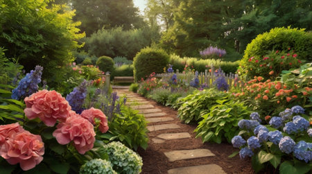 A picturesque garden pathway lined with blooming flowers and lush greenery creates a serene atmosphere perfect for relaxation.