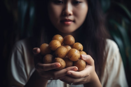 Portrait of a young woman with a longan fruit in hand, highlighting its unique texture and sweet flavor