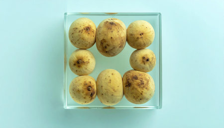 Langsat seeds encased in a clear glycerin block on acrylic pristine geometry with soft cyan tone scientific still life for editorial education and branding