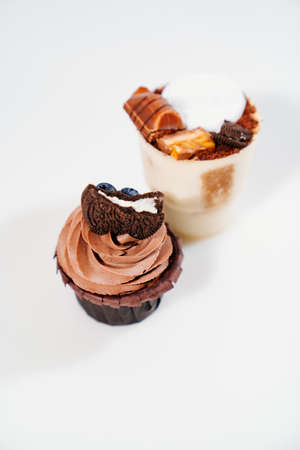 dessert in a glass and chocolate cupcake with cream on white background.