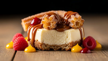 cheesecake with raspberries and chocolate on a wooden table