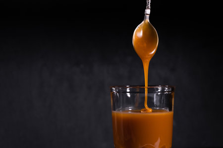 Homemade salted caramel on a dark table with a beautiful black spoon and milk. Delicious dessert for breakfast.