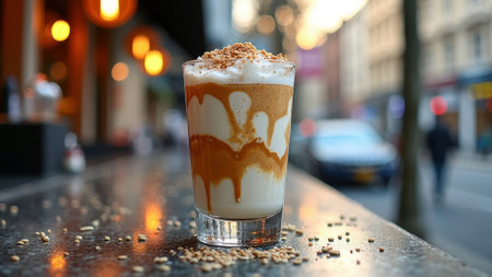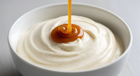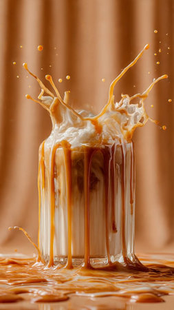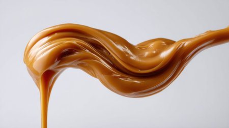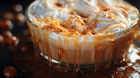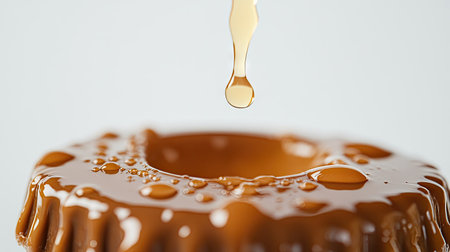 Flowing caramel cream creates a smooth, swirling pattern, capturing the essence of sweetness and indulgence
