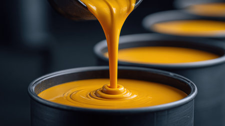 A striking image capturing vibrant orange paint being poured into a sleek black metal canister, showcasing the smooth and glossy texture ideal for artistic projects.