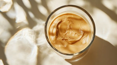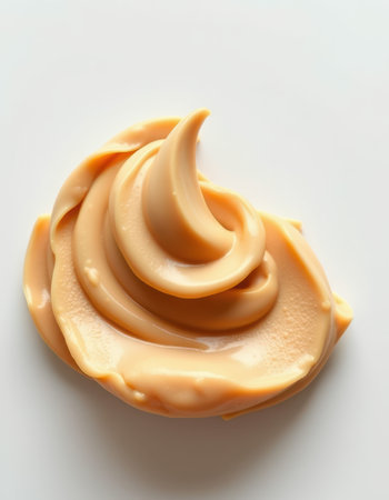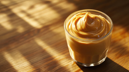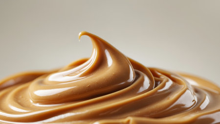 AI Generated. Close up of creamy smooth peanut butter texture with glossy sheen and rich golden brown color perfect for food and culinary backgrounds