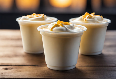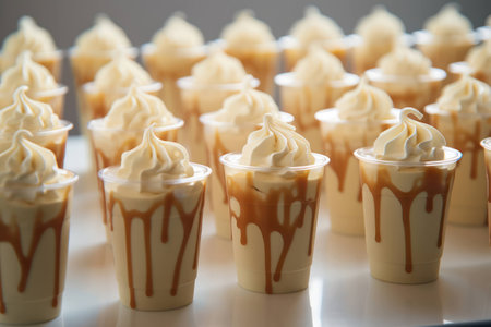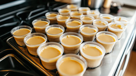 A collection of creamy dessert cups arranged neatly on a modern kitchen countertop, perfect for serving at gatherings or events. These treats promise rich flavors.