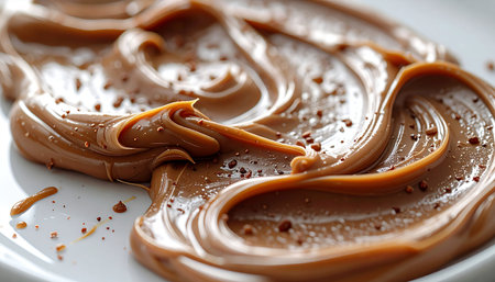 A luxurious, close-up view of rich, creamy chocolate and hazelnut spread, artfully swirled on a clean white surface. The glossy texture and decadent appearance evoke a sense of pure indulgence and gourmet pleasure, perfect for culinary and lifestyle concepts.