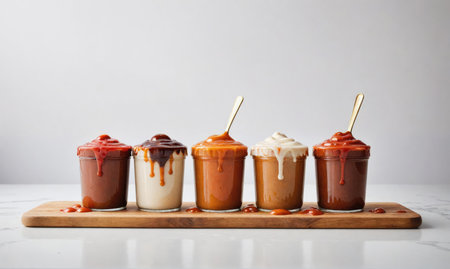 Five jars of caramel sauce sit on a wooden cutting board, ready to be enjoyed