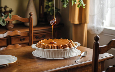 A close-up view of warm caramel sauce flowing into a baking dish, showcasing its glossy and smooth texture, ideal for dessert lovers and culinary enthusiasts.
