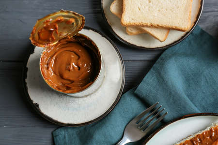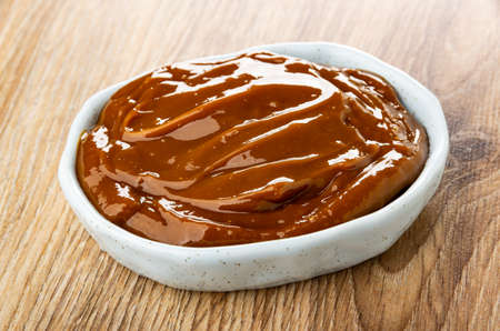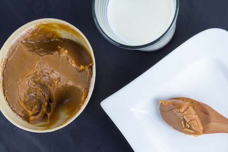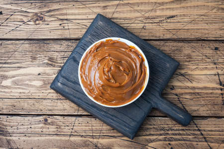 Boiled condensed milk in a plate. Sweet pasta spread for Breakfast and dessert. Copy space