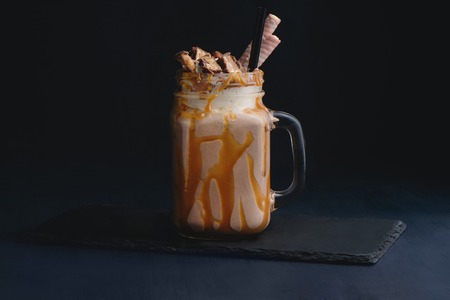 Cold chocolate and caramel milkshake in a vintage glass mason jar. Dark background with copy space for a menu.