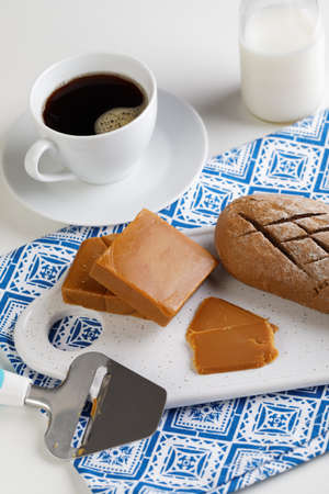Norwegian breakfast with Brunost cheese, bread, and coffee