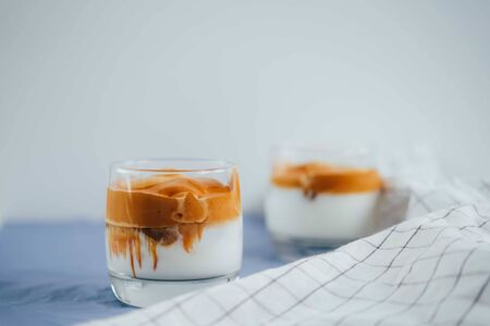 Korean trendy dalgona coffee, fluffy creamy whipped drink.