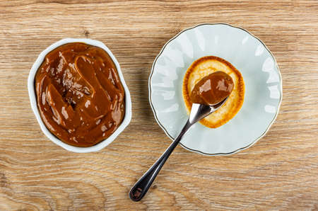 Sweet boiled condensed milk in light-blue bowl, spoon with condensed milk on pancake in saucer on wooden table. Top view