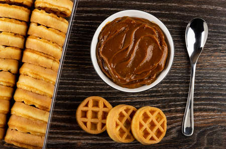 Transparent plastic box with soft biscuit waffles, white bowl with boiled condensed milk, teaspoon, few round waffles on dark wooden table. Top view