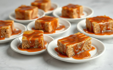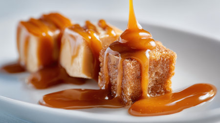 Slices of soft cake are drizzled with rich caramel sauce on a clean white plate. The dessert looks tempting and indulgent perfect for satisfying a sweet tooth.