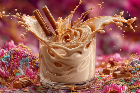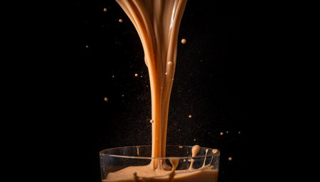 Smooth chocolate pouring, splashing in drinking glass generated by artificial intelligence