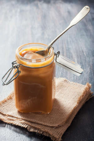 Boiled condensed milk with a glass jar on a wooden background. Sweet pasta spread for Breakfast and dessert. Copy space