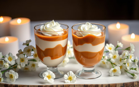 Two creamy desserts with whipped cream topping sit on a table with flowers and candles